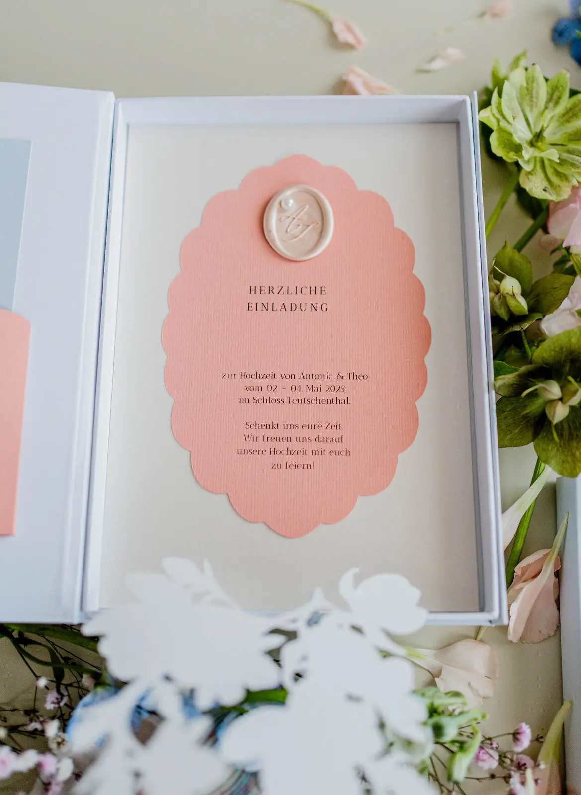 So beginnt Exklusivität: mit einem sinnlichen Moment. Diese Einladung erzählte schon vor dem Hochzeitstag von der Atmosphäre, die Antonia & Theo schaffen wollten – stilvoll, ruhig und bedeutungsvoll.
